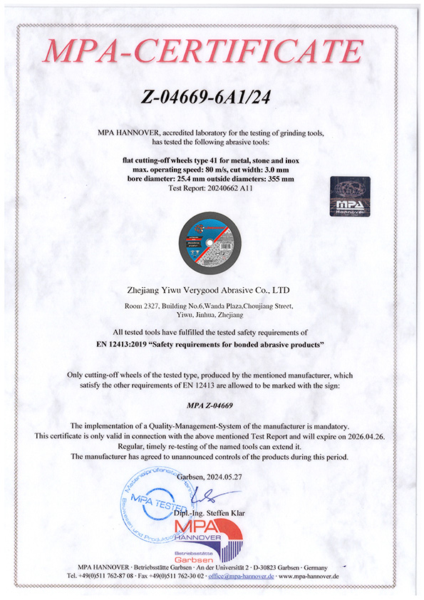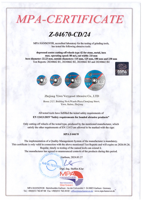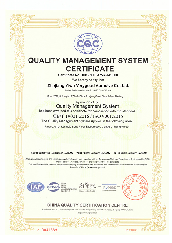 YIWU VERYGOOD ABRASIVES CO.,LTD. has more than 20 years of experience in production, research and development, and export of resin cutting and grinding wheels. Our products have advantages in cuting and grinding various metal and non-metal materials, and they have the characteristics of fast cutting, economical and practical. Product performance can meet European MPA standard and EN12413 standard. Our factory covers an area of 8,000 square meters, has more than 20 sets of advanced automatic production and testing equipment, and has an annual production capacity of 30 milion grinding wheels.Our products are widely used for most industrial work. And are both popular at domestic and abroad, which have been exported to many countries such as the USA, Mexico,Australia,Japan, Singapor,Malaysia and Thailand etc. We accept OEM and ODl orders, welcome every customer to visit and negotiate, and look forward to cooperating with you. |