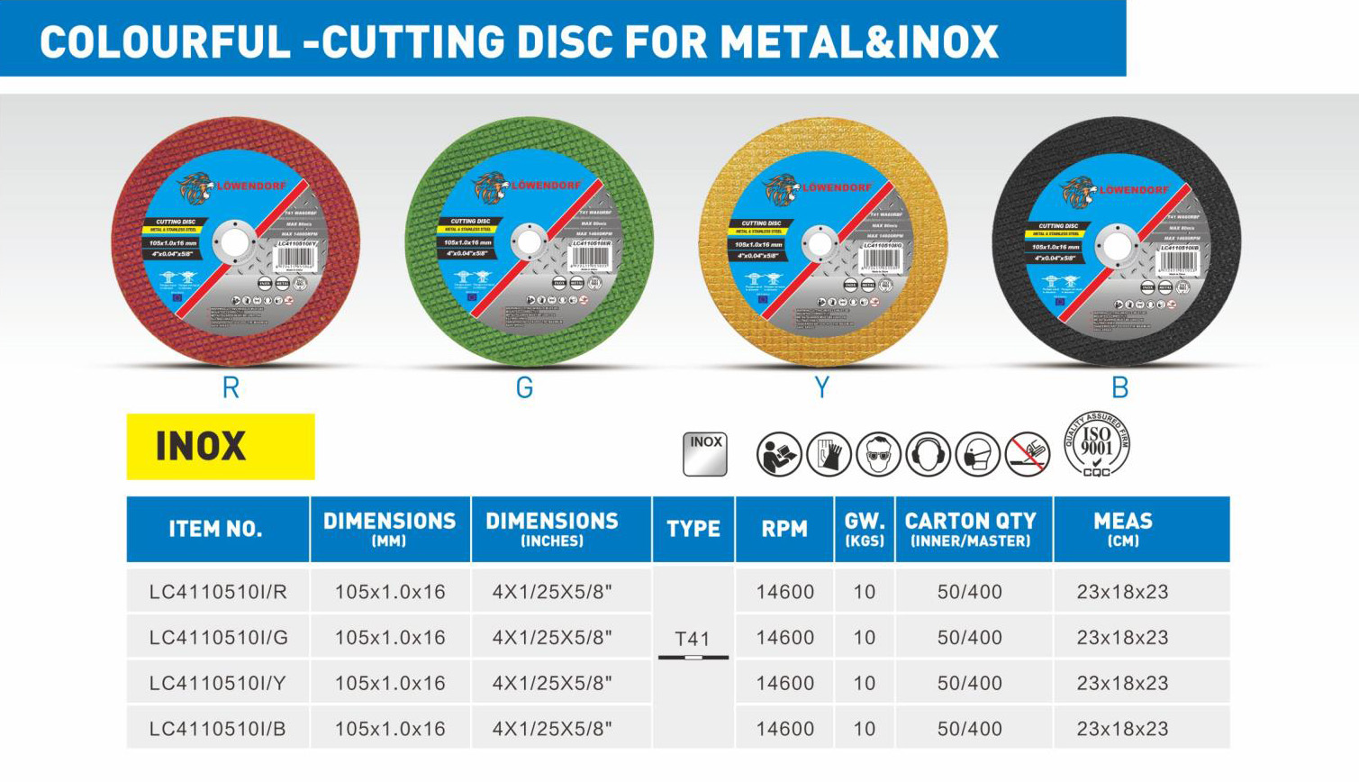 Product Description: The Colourful Abrasive Cutting Wheel is a versatile and visually striking tool, designed for cutting through a variety of materials such as metal, wood, plastic, and masonry. Its vibrant color scheme not only enhances visibility during use but also assists in differentiating between different grades and types of wheels, ensuring optimal selection for various cutting tasks. Crafted from high-quality abrasive materials, these cutting wheels are built for exceptional performance and longevity. Functions: Precision Cutting: Designed to make clean, accurate cuts in multiple materials, catering to diverse applications in construction, metalworking, and fabrication. Quick Material Removal: Engineered for efficient cutting, allowing users to complete projects faster while maintaining quality. Low Vibration: Provides stability during operation, reducing user fatigue and enhancing control. Advantages: Color-Coded Efficiency: The distinct colors of the wheels help users easily identify the right cutting wheel based on their specific needs, improving workflow efficiency. Durability: Made from high-quality abrasives that withstand high speeds and heavy use, ensuring a longer lifespan and consistent performance. User-Friendly: Compatible with a wide range of cutting tools, easy to install, and perfect for both professional and amateur users.